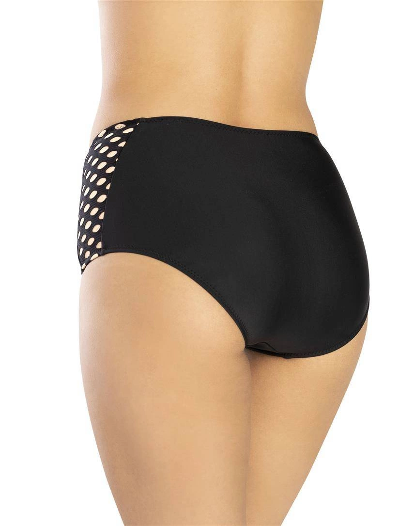 Wygodne, kąpielowe majteczki z ażurowymi bokami, w czarno-beżowym kolorze. Wyższe, dzięki temu z pewnością poczujesz się w nich bardzo wygodnie. Przód na podszewce, tkanina włoska, szybkoschnąca. Skład: 80% poliamid, 20% elastan.