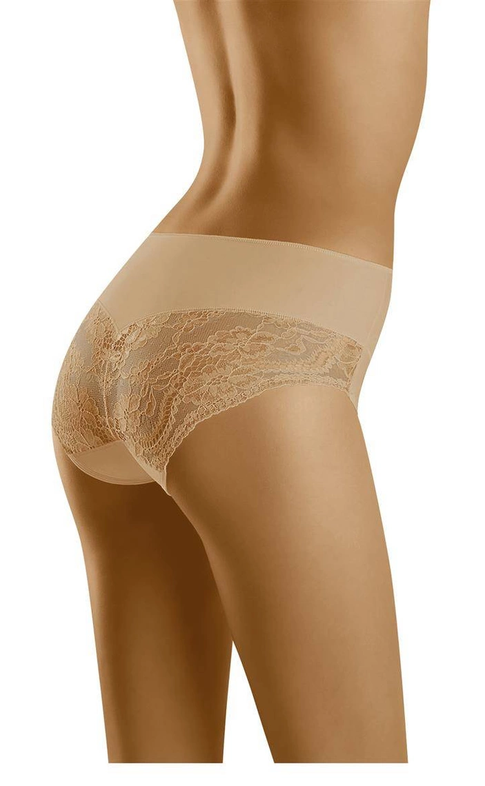 Wygodne, nieco wyższe figi, subtelnie modelujące rejon brzucha, które uwodzą zarówno komfortowym krojem jak i piękną koronką. Koronka na pośladkach, seksownie je akcentuje. Skład: 58% poliamid, 42% elastan.