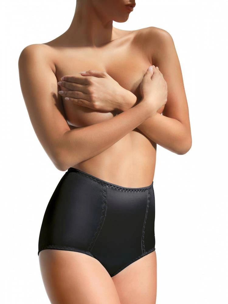 Czarne, modelujące ciało figi o wyższym kroju, wykończone u góry elastyczną taśmą. Gładkie, przyjemne w dotyku, wpływają na poprawę wyglądu strefy brzucha. Skład: 80% poliamid, 20% elastan.