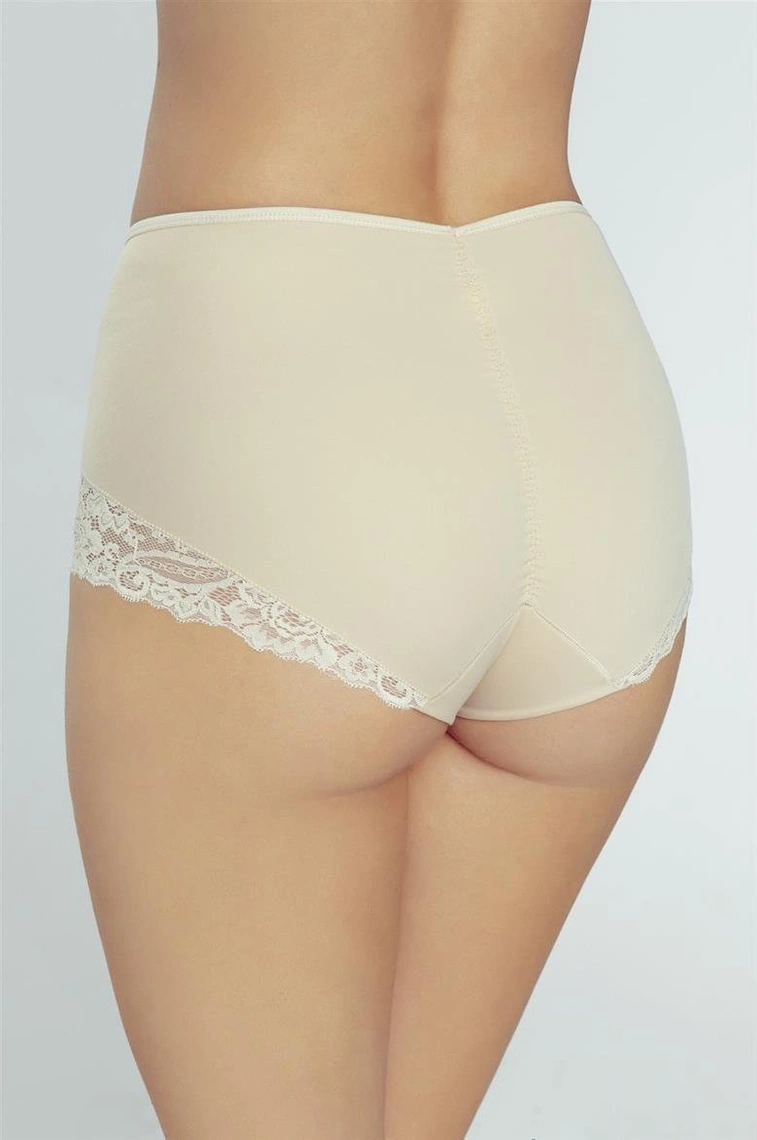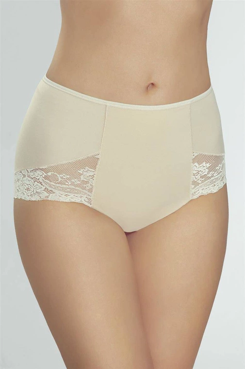Delikatnie modelujące ciało figi, zdobione wokół ud ażurową koronką. Pozwalają uzyskać efekt wyszczuplenia partii brzucha, przy jednoczesnym zachowaniu bardzo estetycznego i eleganckiego wyglądu. Z tyłu pionowe szycie, które pozwala bieliźnie ładnie ułożyć się na pośladkach. Skład: 80% poliamid, 17% elastan, 3% bawełna.