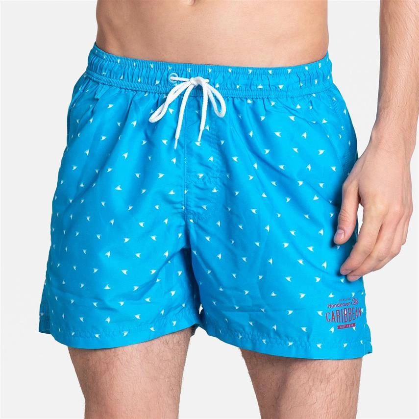 Bardzo wygodne, luźne szorty kąpielowe na podszewce, z najnowszej kolekcji marki Henderson, edycja Lato 2021. Wyróżniają się świetnym, niebieskim kolorem (w pięknym odcieniu) pokrytym drobniutkim wzorem. Komfortowy krój: wygodna, elastyczna, miękka guma w pasie z dodatkowym sznurkiem do regulacji obwodu. Tkanina szybkoschnąca. Z tyłu kieszonka ze szlufką. Skład: 100% poliester.
