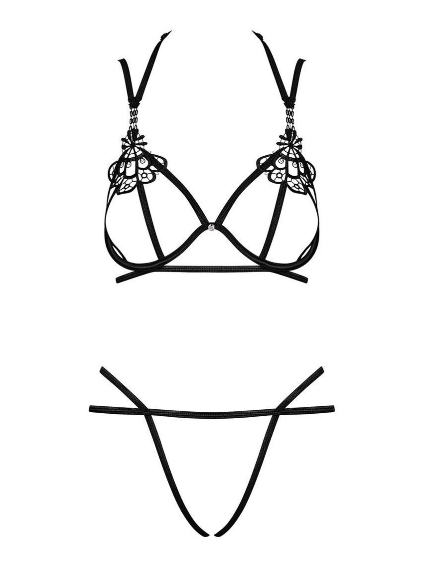 Masz ochotę na coś sexy? Zamów dla siebie (i dla Jego oczu) ten kuszący, dwuczęściowy komplet bielizny typu open, w którym Twoje ciało będzie wyglądać wspaniale. Idealne połączenie cieniutkich paseczków, sprytnie i umiejętnie poprowadzonych po ciele, do tego efektowne, kwieciste hafty plus krój, który uwodzi spojrzenie... Czarny kolor w tym projekcie sprawdza się idealnie. Paseczki w formie elastycznych gumek. Ramiączka o regulowanej długości. Skład: 44% poliamid, 56% elastan.