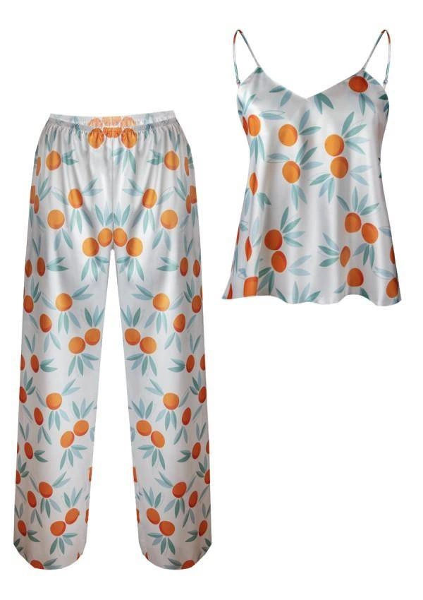Wygodna, dwuczęściowa piżama wykonana z miękkiej, drukowanej satyny. Zaprojektowana tak aby podkreślić linię biustu, oczarować delikatnym dekoltem i ślicznymi, cieniutkimi ramiączkami, których długość można regulować. Spodnie długie o komfortowych nogawkach, na miękkiej gumce w pasie. Skład: 100% poliester.