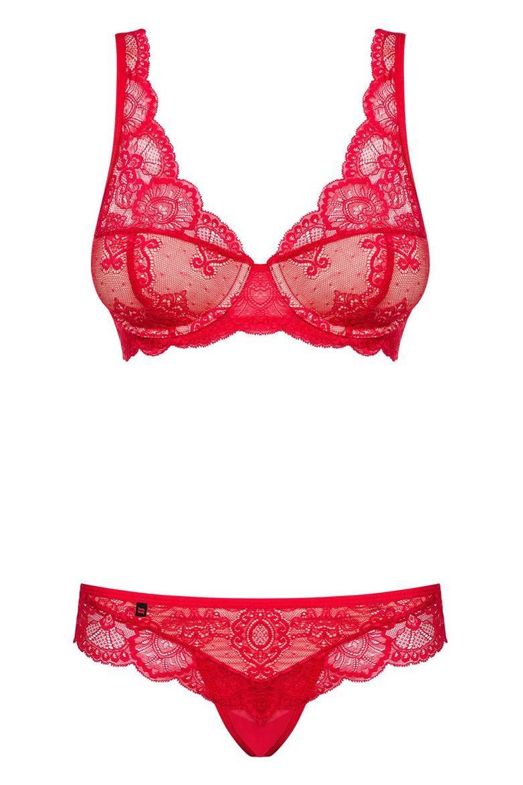 Prawdziwie kobiecy, czerwony, dwuczęściowy komplet bielizny, w którym od razu się zakochasz. Miseczki usztywniane, z fiszbinami, podszyte beżową tkaniną, całkowicie koronkowe - pięknie zbierają i unoszą piersi, tworząc seksowny dekolt. Koronka płynnie przechodzi aż na ramiączka, co wygląda bardzo ładnie. Stringi, perfekcyjnie uzupełniają cały komplet. Skład: 90% poliamid, 10% elastan.
