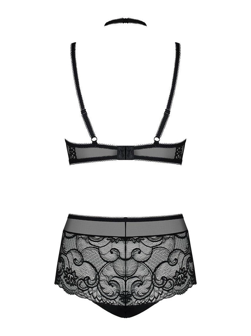 Zmysłowy, dwuczęściowy komplet bielizny wykonany z delikatnej, niezwykle kuszącej koronki. Każda z części ma swój piękny, niepowtarzalny urok. Biustonosz posiada bardzo ładnie wyprofilowane miseczki z fiszbinami, dzięki temu dekolt prezentuje się bardzo atrakcyjnie. Ramiączka podwójne, nieodpinane, połączone z pięknym, dekoracyjnym motywem na szyi. Na plecach zapięcie. Figi wyższe, bardzo kobiece, również koronkowe. Skład: 90% poliamid, 10% elastan.