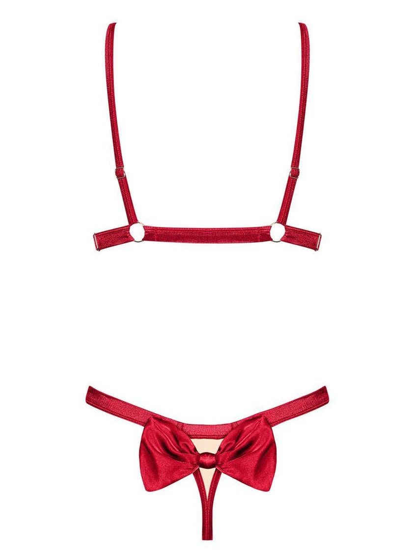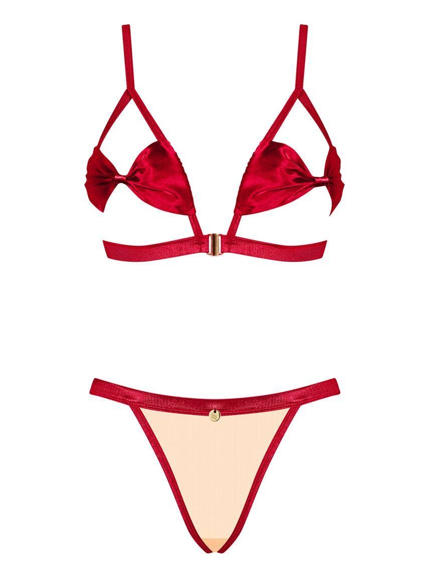 Masz ochotę na coś sexy ale jednocześnie pragniesz aby całość prezentowała się szalenie kobieco? Postaw na ten niezwykły, dwuczęściowy komplet w pięknym, rubinowym kolorze. Wykonany z połączenia miękkiej, jedwabistej w dotyku satyny oraz delikatnego, elastycznego tiulu w odcieniu skin tone. Biustonosz z efektem kokard, zapinany z przodu. Stringi lekko prześwitujące, z kokardą nad pośladkami. Skład: 90% poliamid, 10% elastan.