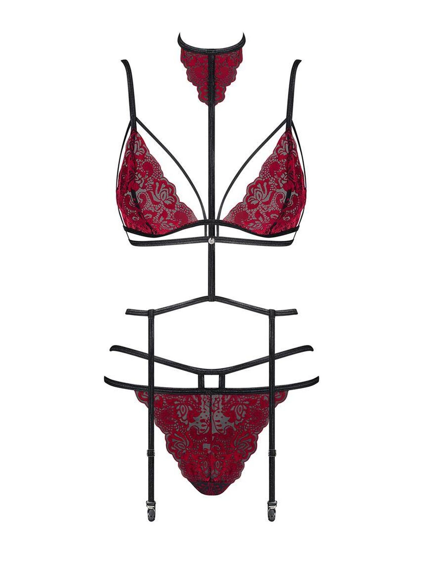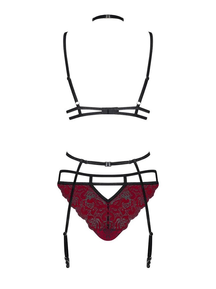 Trzyczęściowy komplet bielizny wykonany z efektownej koronki w kolorze czerwonego wina. Pokryty stylowym, kwieciestym ornamentem. Wzór jest wyczuwalny pod palcem i prezentuje się wyjątkowo szlachetnie. W takiej bieliźnie z pewnością będziesz wyglądać nieziemsko. W komplecie biustonosz o miękkich miseczkach z ozdobnymi cieniutkimi paseczkami na dekolcie, piękne, wygodne figi oraz pas do pończoch w formie elastycznych gumek z dołączoną do niego, pasującą do kompletu, koronkową ozdobą na szyję. Skład: 94% poliamid, 6% elastan.