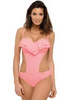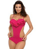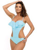 Jednoczęściowy, o kroju monokini - posiada wycięte boki, co nadaje całości nowoczesnego charakteru. Górę kostiumu tworzy seksowny push-up, a dokładnie wyprofilowane miseczki, usztywniane specjalną pianką, z wbudowanym na stałe i nie wyjmowanym z modelu, wypełnieniem push-up (push-up występuje w każdym rozmiarze kostiumu). Krój unosi i powiększa piersi, tworząc sexy dekolt, zdobiony zwiewną falbaną. A to jeszcze nie wszystko. Kostium uszyto z włoskiej, elastycznej tkaniny, jest gładki, wygodny, wiązany na plecach i ma całkowicie odpinane ramiączka. Soczysta kolorystyka do wyboru w aż kilkunastu wariantach - wybierz go w swoim ulubionym kolorze. Skład: 80% poliamid, 20% elastan.