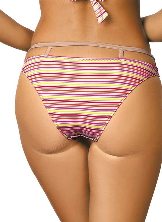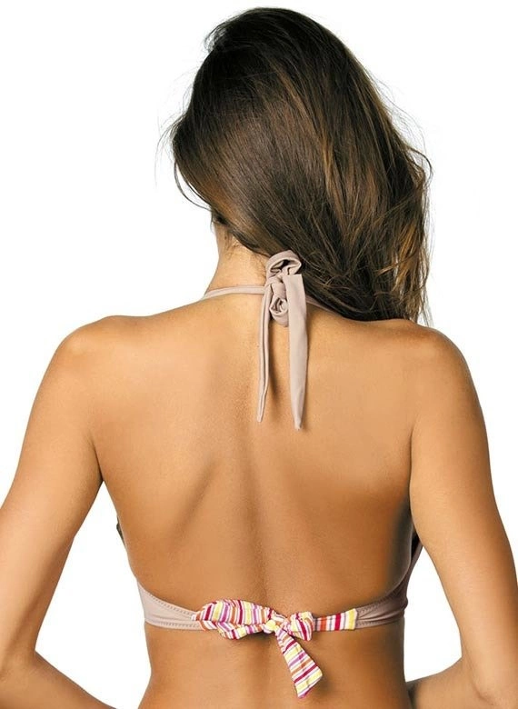 Śliczny, dwuczęściowy kostium kąpielowy o dobrze wyprofilowanych miseczkach. Taki, który tworzy kuszący dekolt. Miseczki świetnie zbierają piersi, dobrze je modelują i jednocześnie wypychają ku górze. Od wewnątrz zostały usztywnione i wzbogacone o wbudowane na stałe wypełnienie push up (dostępne we wszystkich rozmiarach), z bocznymi fiszbinami. Śliczna lamówka od razu wpada w oko. Ramiączka z broszkami, eleganckie, wiązane na szyi. Obwód jest wygodnie wiązany na plecach. U podstawy - delikatnie marszczona tkanina, która podkreśla wyjątkowy charakter kostiumu. Figi z dodatkowym paseczkiem, który biegnie wokół bioder. Miękkie, na podszewce.