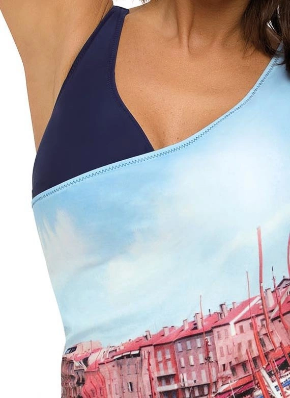 Jednoczęściowy kostium kąpielowy wykonany z pięknej, wzorzystej tkaniny z nadrukiem zdjęcia.