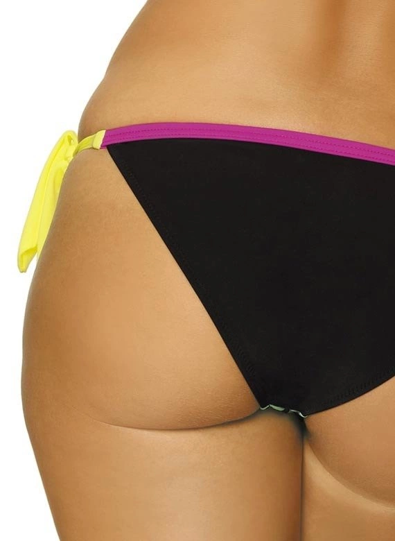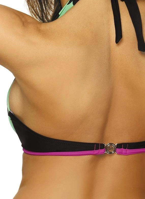 Biustonosz z dekoltem typu halter neck a'la Marylin Monroe, usztywniany i z bocznymi fiszbinami, świetnie zbiera piersi, modeluje je i pięknie prezentuje dekolt. Stylistyka urocza, kobieca, delikatna, acz z charakterem. Ramiączka wiązane na szyi, obwód zapinany na plecach na klamerkę. Figi idealnie dopasowane do biustonosza, wiązane po bokach na kokardki, w soczystym kolorze. Wspaniale zdobią biodra, dają sporą wygodę, bowiem mają fajny, biodrówkowy fason. Idealny strój dla kobiety, która chce po prostu świetnie wyglądać na plaży.