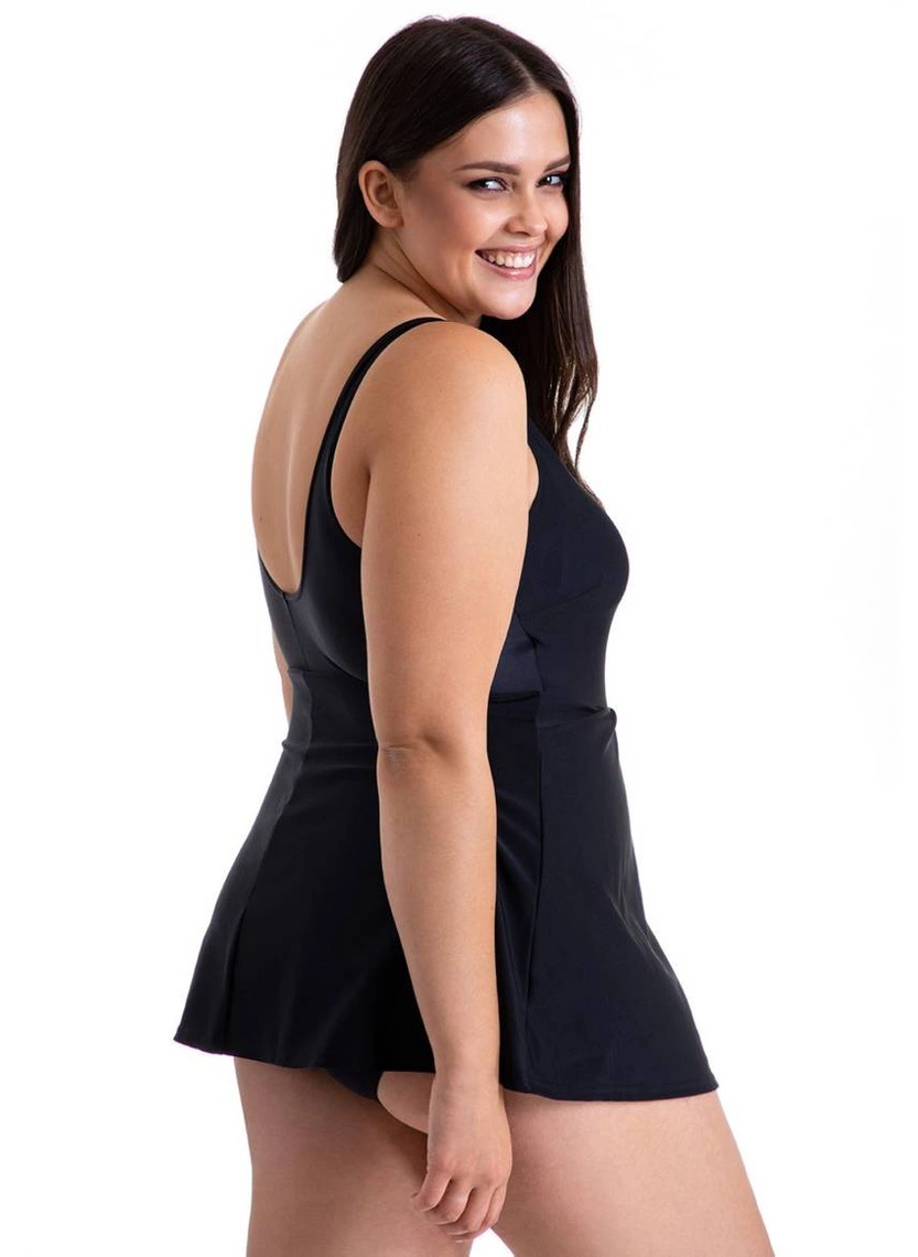 Dostępny w wielu kolorach i rozmiarach (do 4XL) strój Julietta poradzi sobie nawet z dużym biustem, estetycznie go eksponując i zapewniając niezbędną stabilność. Usztywnione delikatną pianką miski (jedynie z przodu, a nie u podstawy) pozbawione zostały fiszbin, dzięki czemu miękko dopasują się do każdego obwodu. Dobre ułożenie na sylwetce wspomoże specjalna gumka stabilizująca wszyta tuż pod linią biustu. Wygodne, szerokie ramiączka zostały ozdobione w miejscu wszycia w przód kostiumu niewielkimi kółkami w dopasowanym do całości kolorze. Plecy zostały nieco bardziej zabudowane niż przód - materiał sięga linii obwodu. Lekko zmarszczona spódniczka wierzchniej warstwy została zaprojektowana tak, by ładnie układać się na sylwetce i delikatnie opadać na brzuch i uda, bez efektu napiętego materiału. Klosz sukienki rozpoczynający się kilka centymetrów pod linią biustu pozwoli poprawić dysproporcje sylwetki, zakryje brzuch, a jego dolna krawędź podkreśli linię bioder. Przód i tył spodniej, bazowej części stroju został dodatkowo wzmocniony elastyczną podszewką, która wpłynie na trwałość kostiumu i podkreśli efekt wyszczuplający.