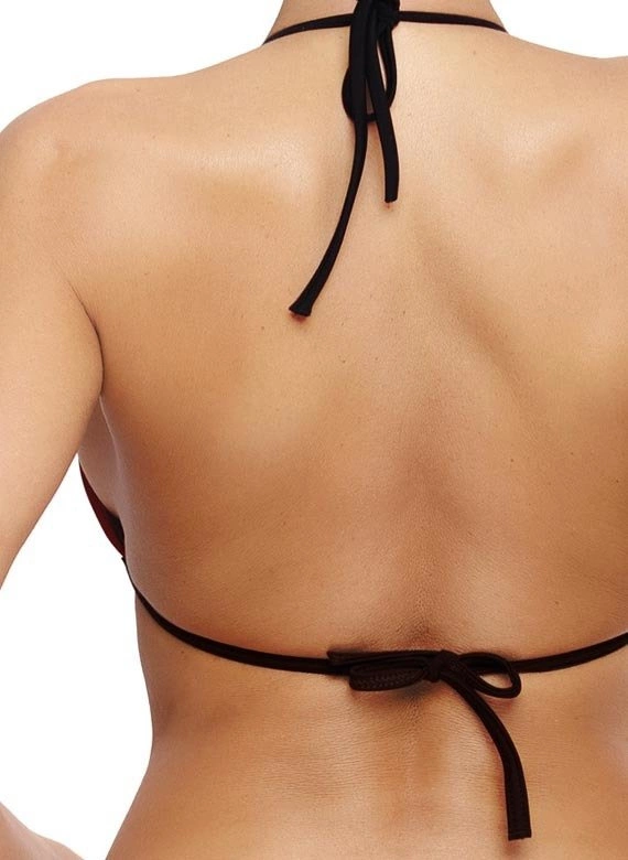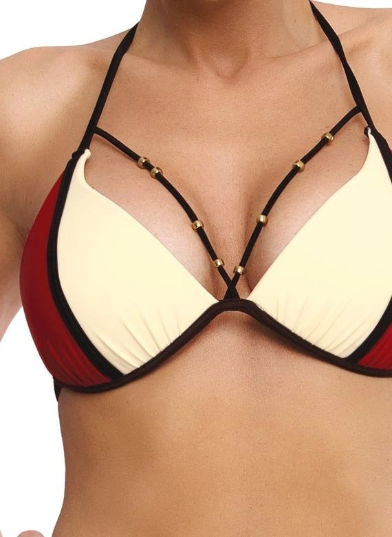 Gładkie miseczki z kontrastową, czarną lamówką są usztywniane, bez push-up-a, dobrze zbierają i usztywniają piersi jednocześnie przybliżając je ku sobie. Dekolt dopełniają dwa, ozdobne paski wykończone maleńką biżuterią. Kuszące figi, typu niskie biodrówki to bardzo kobieca propozycja na plażę. Włoska tkanina. Skład: 80% poliamid, 20% elastan.