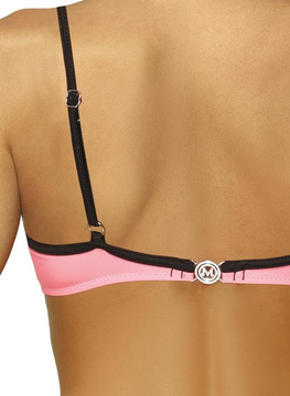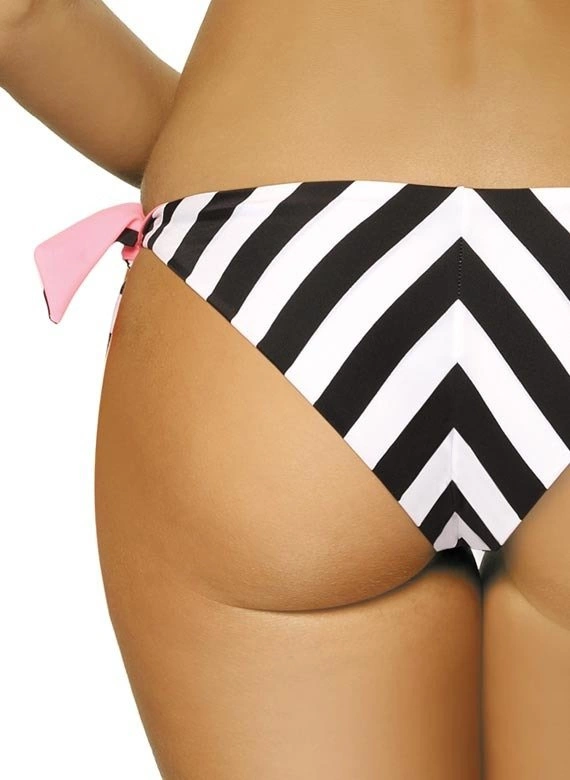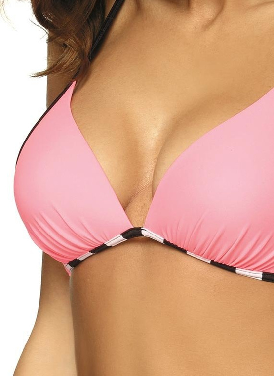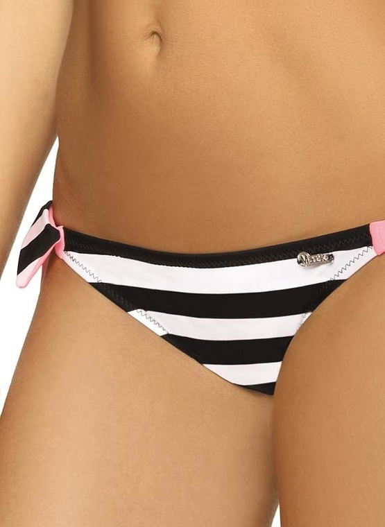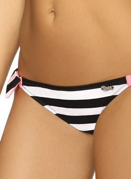 Górę kostiumu stanowi biustonosz o usztywnianych miseczkach, który dopełniono podbiciem push up. Jest ultra kobiecy, gładki, delikatnie marszczony u podstawy. Wygląda słodko i kokieteryjnie. Konstrukcja przewidziana na małe i średnie biusty, dobrze zbiera, unosi i przybliża piersi ku sobie, pięknie prezentując je w dekolcie. Obwód elastyczny, wygodnie zapinany na plecach. Ramiączka o regulowanej długości. Figi w stylu brazylijskim, w zgrabne paski (z przodu pionowe, z tyłu ukośne), kusząco wiązane po obu stronach bioder. Fason typu "niska biodrówka", atrakcyjny, będzie idealnie wyglądał na plaży. Aby uzyskać zamierzony, brazylijski efekt, figi należy mocno pociągnąć ku górze bioder, wówczas seksowny krój wspaniale ozdobi pośladki.