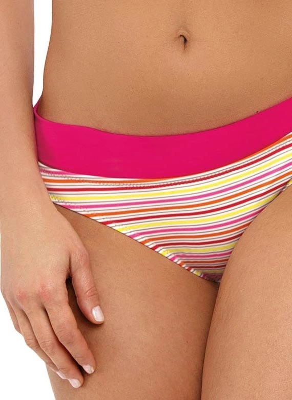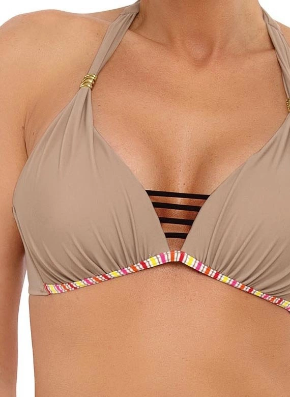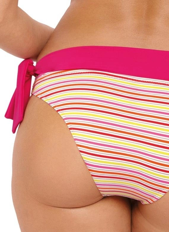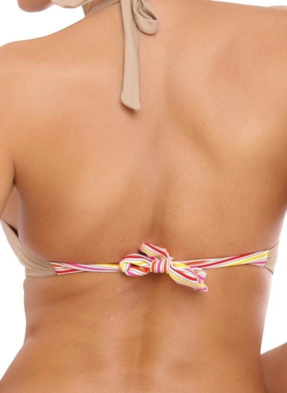 Biustonosz z trójkątnymi miseczkami usztywnianymi specjalną pianką, wzbogacony push-up-em - dzięki niemu piersi uniosą się i optycznie powiększą, tworząc zmysłowy, głęboki dekolt. Push-up umieszczony jest w kostiumie na stałe i nie jest wyjmowany z modelu, występuje w każdym rozmiarze kostiumu. Biustonosz zwraca także uwagę modnym dodatkiem w postaci "pasków-gumek" umieszczonych przy dekolcie. Ładne ramiączka wiązane na szyi, zdobione delikatną, biżuteryjną ozdobą (można ją zdjąć), będą atrakcyjnie prezentować się w promieniach słońca. Majteczki o doskonałym kroju "midi" - o wyśrodkowanej wysokości. Są wzorzyste i ozdobnie wiązane na boku (klasyczny, wkładany krój). Skład: 80% poliamid, 20% elastan.