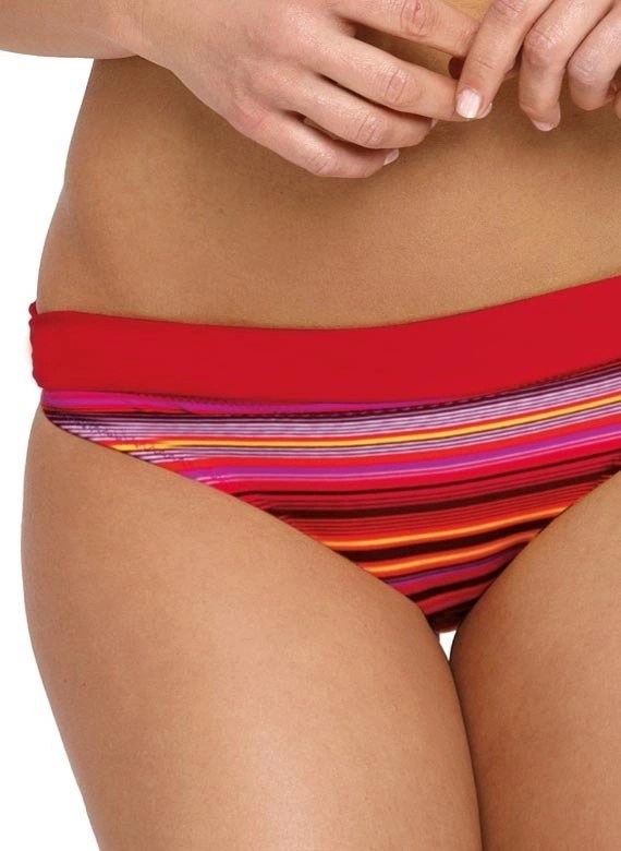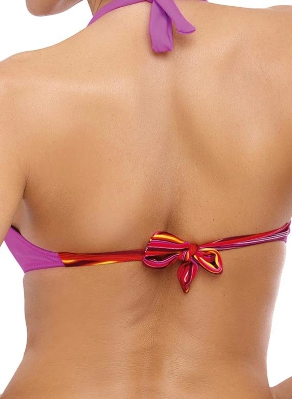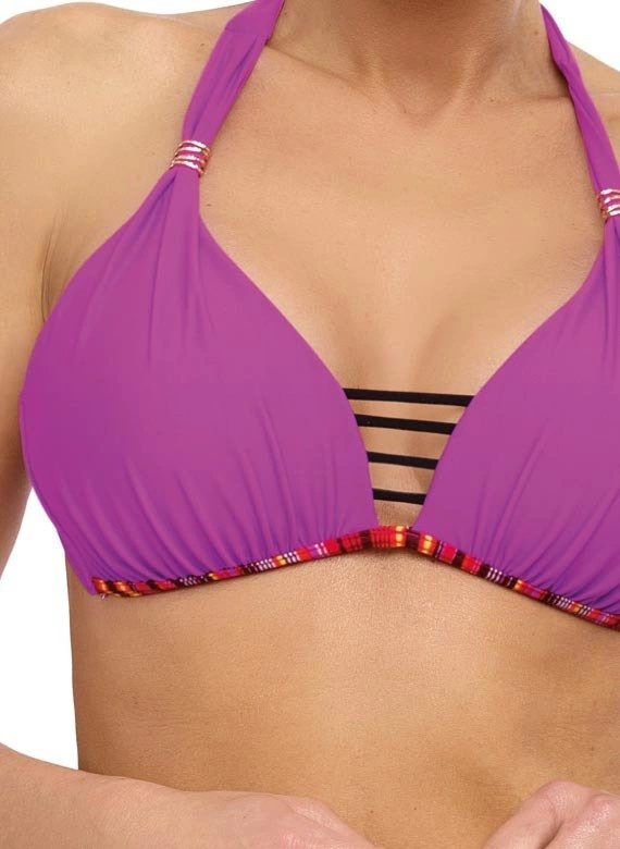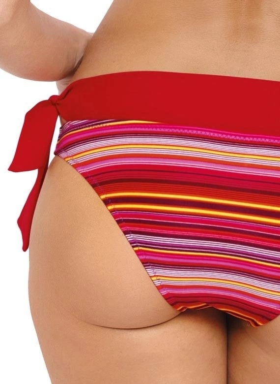 Biustonosz z trójkątnymi miseczkami usztywnianymi specjalną pianką, wzbogacony push-up-em - dzięki niemu piersi uniosą się i optycznie powiększą, tworząc zmysłowy, głęboki dekolt. Push-up umieszczony jest w kostiumie na stałe i nie jest wyjmowany z modelu, występuje w każdym rozmiarze kostiumu. Biustonosz zwraca także uwagę modnym dodatkiem w postaci "pasków-gumek" umieszczonych przy dekolcie. Ładne ramiączka wiązane na szyi, zdobione delikatną, biżuteryjną ozdobą (można ją zdjąć), będą atrakcyjnie prezentować się w promieniach słońca. Majteczki o doskonałym kroju "midi" - o wyśrodkowanej wysokości. Są wzorzyste i ozdobnie wiązane na boku (klasyczny, wkładany krój). Skład: 80% poliamid, 20% elastan.