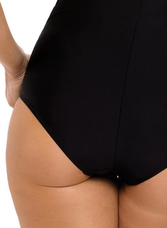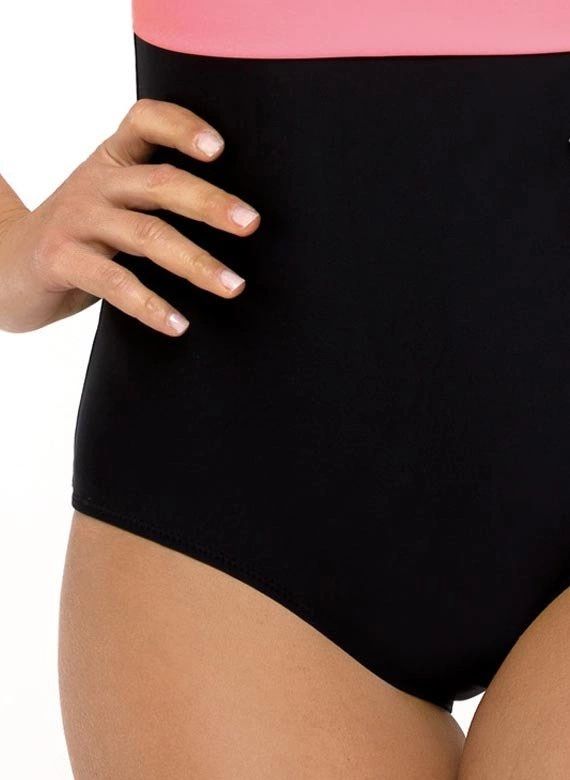 Kostium posiada usztywniane miseczki bez push-up-a, ukryte po wewnętrznej stronie modelu, dzięki którym można ładnie zebrać piersi i odpowiednio wymodelować je w dekolcie. Jest wygodny i bardzo kobiecy. Dobrze prezentuje się właściwie w każdym rozmiarze. Dół w czarnym kolorze optycznie wyszczupla sylwetkę. Tkanina włoska, elastyczna. Ramiączka o regulowanej długości. Skład: 80% poliamid, 20% elastan.