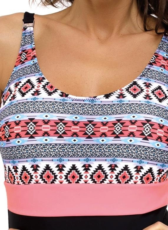 Stylowy kostium jednoczęściowy w egzotycznej kolorystyce.Wyróżnia się wzorzystą górą, wykonaną z barwnej, matowej tkaniny.