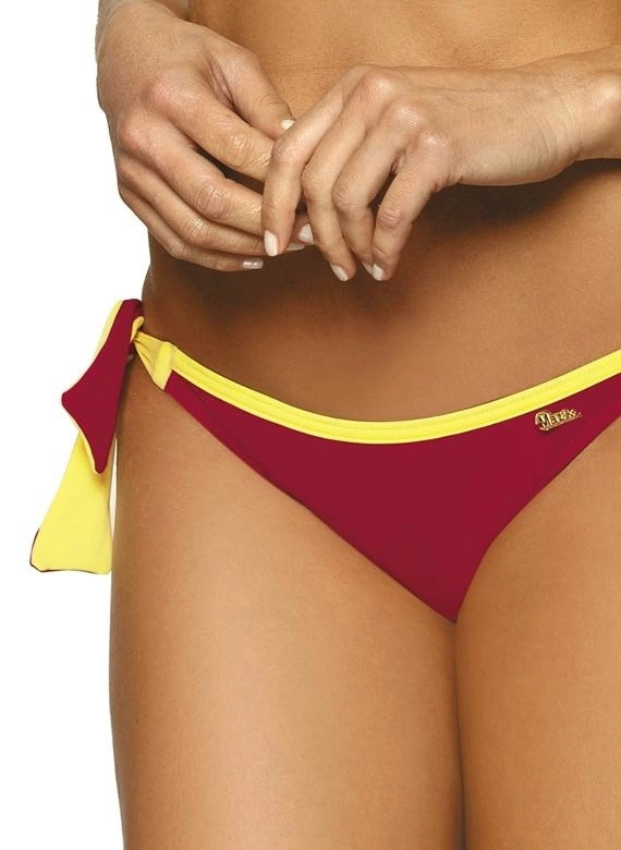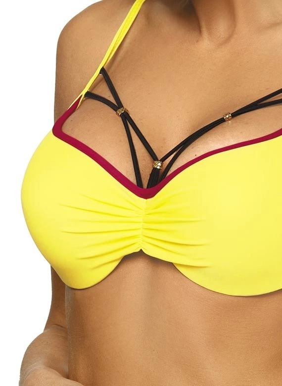 Biustonosz o usztywnianych miseczkach, z fiszbinami i wypełnieniem push up, wbudowanym na stałe do modelu. Świetnie unosi piersi, modeluje je i kusząco powiększa, co zresztą widać na zdjęciu. Strapsy (paski-gumki) są elastyczne, z biżuterią w złotym kolorze i mega modne. Dodają prawdziwego seksapealu, na który śmiało można sobie pozwolić na plaży. Ramiączka o regulowanej długości, nieodpinane. Obwód elastyczny, wiązany na plecach. Figi typu brazylijskiego, wysoko wycięte na pośladkach - seksowne i idealne do opalania. Aby uzyskać pełen, brazylijski efekt figi należy znacząco pociągnąć ku górze bioder. Po bokach wygodne wiązania. Ps. Figi z tyłu mają dodatkowe marszczenie na tkaninie, które optycznie zmysłowo zaokrągla pupę.