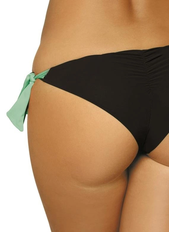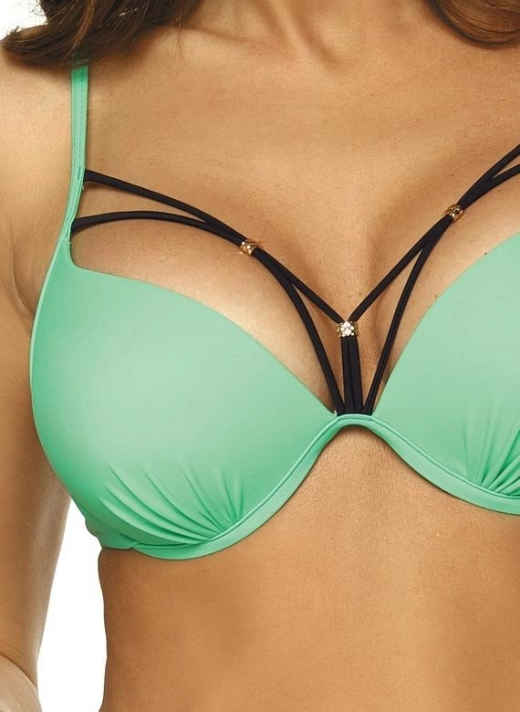 Biustonosz o usztywnianych miseczkach na fiszbinie mocno przybliża piersi ku sobie, co zresztą widać na zdjęciu, a wbudowane do modelu wypełnienie push up, dodatkowo optycznie powiększa biust. Efekt? Jędrny, kuszący dekolt. Strapsy (paski-gumki) są elastyczne, z biżuterią w złotym kolorze i mega modne. Dodają prawdziwego seksapealu, na który śmiało można sobie pozwolić na plaży. Ramiączka o regulowanej długości, nieodpinane. Obwód elastyczny, zapinany na klamerkę, polecany również paniom noszącym wąskie obwody biustonoszy. Figi typu brazylijskiego, wysoko wycięte na pośladkach - seksowne i idealne do opalania. Aby uzyskać pełen, brazylijski efekt figi należy znacząco pociągnąć ku górze bioder. Po bokach wygodne wiązania. Ps. Figi z tyłu mają dodatkowe marszczenie na tkaninie, które optycznie zmysłowo zaokrągla pupę.