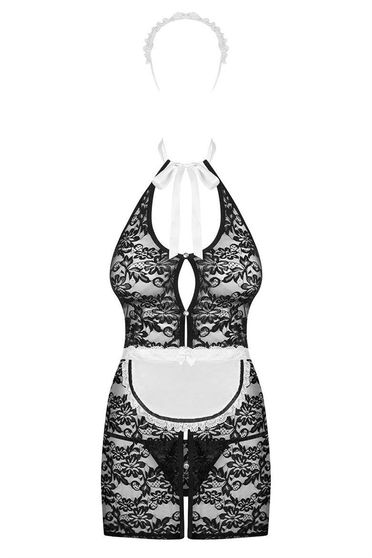 Czy ktoś zawołał kelnerkę? Servgirl wchodząc do pokoju skupia na sobie całą uwagę Twojego mężczyzny... Tak, ten plan może się ziścić! Załóż na siebie ten słodki i do tego niesamowicie seksowny, koronkowy strój, w którym będziesz wyglądać świetnie! Koszulkę wykonano z czarnej, elastycznej koronki i uzupełniono ją białą wstążką wiązaną wokół szyi na kokardkę i ślicznym fartuszkiem wiązanym nad pośladkami. Stringi oraz opaska na włosy także należą do zestawu. Pończochy s800 w osobnej sprzedaży. Skład: 90% poliamid, 10% elastan.