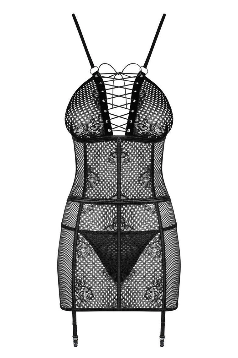 Czarna, seksownie sznurowana na dekolcie, dopasowana do ciała koszulka nocna wykonana z elastycznej przędzy. Zdobiona kwiecistą koronką z przodu i na pośladkach. Zapinana na plecach, w tym miejscu prezentuje również efektowny dekolt. W rejonie talii znajduje się delikatny pasek, dzięki któremu sylwetka nabiera zmysłowych proporcji. Paski do pończoch regulowane i odpinane. Stringi w komplecie. Skład: 90% poliamid, 10% elastan.