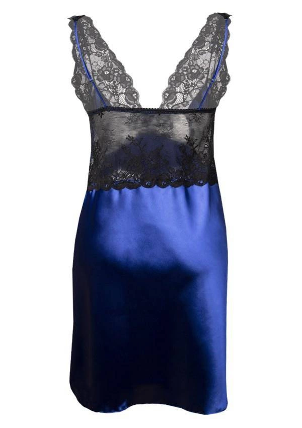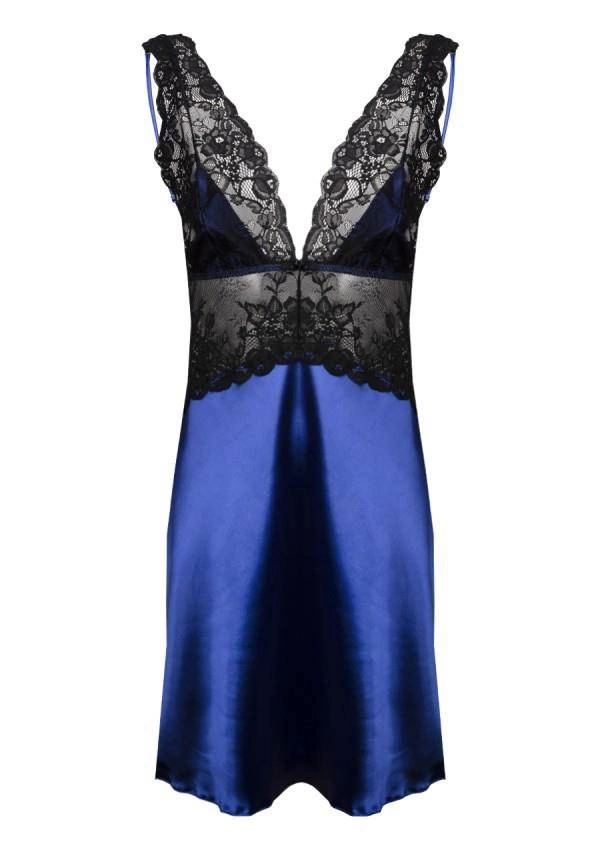 Elegancka, granatowa koszulka nocna z mocną, koronkową wstawką w czarnym kolorze. Niemal pół na pół satyny i koronki pozwoliło uzyskać w tym projekcie bardzo zmysłowy efekt. Góra w formie bralette, skrywa miseczki soft cienkie i regulowane ramiączka. Środkowa część z efektem kuszącego prześwitu. Dół luźny, zwiewny, elegancki. Skład: 100% poliester.