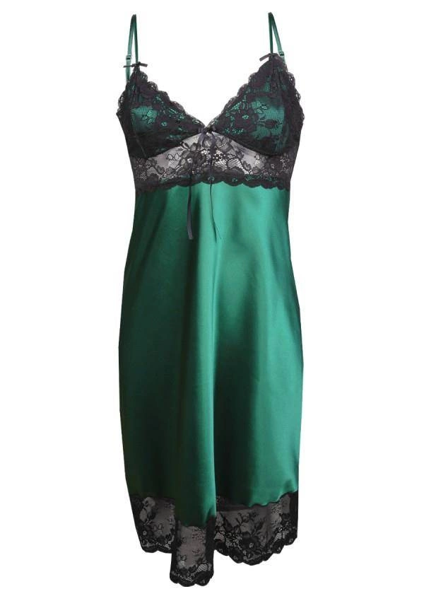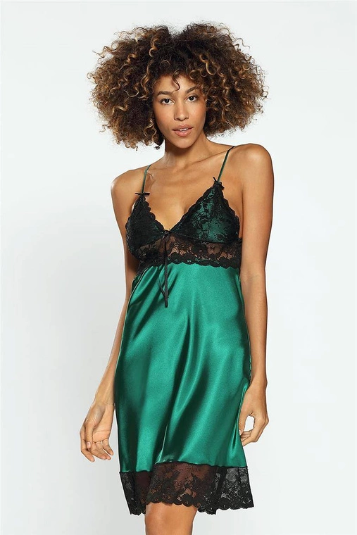 Elegancka, satynowa koszulka nocna z czarną, koronkową górą. W niesamowicie modnym, szmaragdowym kolorze. Miseczki w konstrukcji soft, z cieniutkimi ramiączkami o regulowanej długości i mini kokardkami. Górna część lekko dopasowana, elastyczna, dół luźny, zwiewny, z piękną, koronkową oprawą wokół ud. Najnowsza kolekcja od DKaren. Skład: 100% poliester.