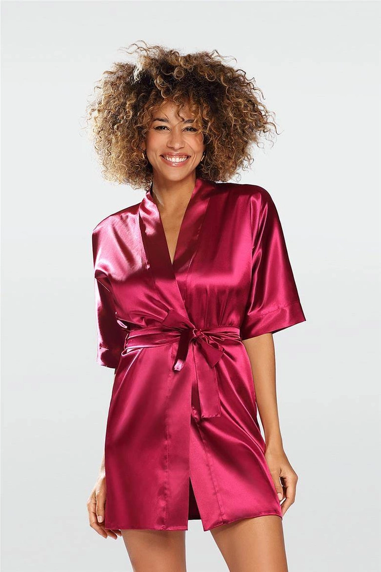 Ekskluzywny peniuar - szlafroczek, wiązany w talii. Gładki, elegancki, kobiecy. Rękawy typu kimono, do okolic łokci. Warto go mieć. Skład: 100% poliester.