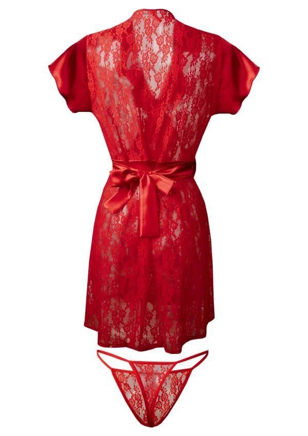 Koronkowy szlafrok idealny na lato. Z satynowymi rękawami, które w tym wydaniu są krótkie, wygodne i bardzo kobiece. Koronka jak zwykle zachwyca swym pięknym, kwiecistym rysunkiem, który zmysłowo zdobi ciało. Dekolt z fikuśną, małą falbaną, z tyłu ciała wiązanie na kokardkę. Skład: 100% poliester.