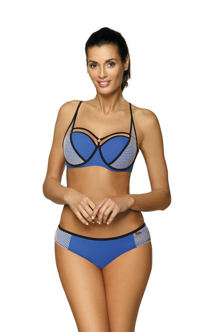 Kostium wspaniale zdobi ciało, a przy tym wygląda szczególnie ciekawie i intrygująco. Strapsy, "siateczkowe" boki, kontrastowe lamówki i śliczna kolorystyka to największe atuty tego modelu. Do tego dochodzi bardzo dobry fason. Biustonosz z fiszbinami (dolnymi i bocznymi), oparty na kroju bardotki, doskonale zbiera, unosi i modeluje piersi oraz jednocześnie optycznie je powiększa. Zawiera stałe (niewyjmowane z biustonosza) wypełnienie push up. Obwód elastyczny, zapinany na klamerkę. Ramiączka nieodpinane, o regulowanej długości. Figi zgrabnie zdobią biodra, są bardzo wygodne i perfekcyjnie dopasowane do całości. Po bokach ażurowe zdobienie. Kostium uszyto z włoskiej, elastycznej tkaniny wysokiej jakości. Najnowsza kolekcja Lato 2018.
