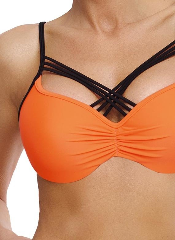 Jest barwny, seksowny, kobiecy i modny. Biustonosz w konstrukcji push-up, z usztywnianymi miseczkami i fiszbinami, profesjonalnie zbiera, modeluje i optycznie powiększa piersi. Dodaje pewności siebie. Konstrukcja jest przewidziana na małe i średnie biusty, bowiem im służy najlepiej. Push-up nie jest wyjmowany z modelu i występuje w każdym rozmiarze kostiumu. Dekolt zdobiony intrygującymi, czarnymi paskami-gumkami, wygląda świetnie. Obwód wygodnie wiązany na plecach, ramiączka o regulowanej długości. Figi gładkie, na paskach-gumkach po bokach, sprawiają, że nogi prezentują się zjawiskowo, a cała sylwetka po prostu wspaniale. Skład: 80% poliamid, 20% elastan.