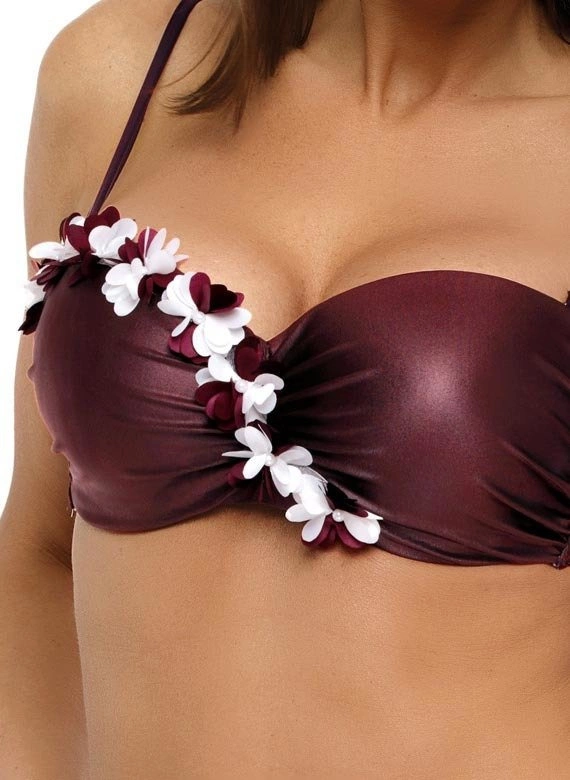 O fenomenalnej konstrukcji, z biustonoszem kierowanym na małe i średnie biusty, którego miseczki dają efekt 2 x push-up. Fason ponętnie zbiera, modeluje i unosi piersi, a dzięki dużym wypełnieniom push-up spektakularnie powiększa piersi, co zresztą widać na zdjęciach. Wypełnienie push-up umieszczone jest w kostiumie na stałe, bez możliwości jego wyjęcia i występuje w każdym rozmiarze. Miseczki usztywniane, z fiszbinami, fason wiązany na plecach, ramiączka całkowicie odpinane. Słodki akcent (ręcznie doszywane kwiaty) w romantycznym wydaniu. Figi uroczo wiązane po bokach. W tym kostiumie z pewnością oczarujesz każde spojrzenie. Skład: 80% poliamid, 20% elastan.