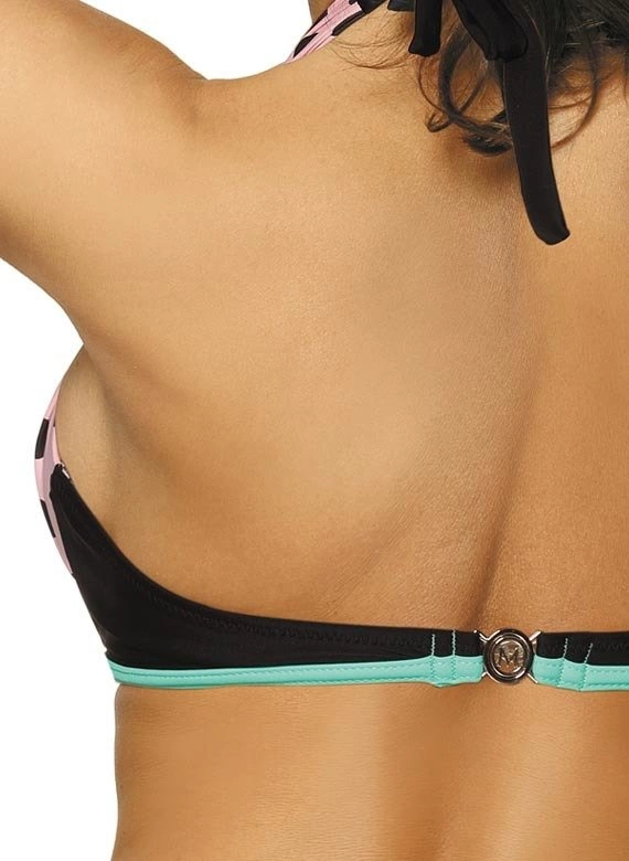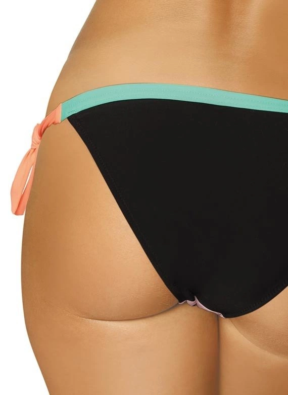 Biustonosz z dekoltem typu halter neck a'la Marylin Monroe, usztywniany i z bocznymi fiszbinami, świetnie zbiera piersi, modeluje je i pięknie prezentuje dekolt. Stylistyka urocza, kobieca, delikatna, acz z charakterem. Ramiączka wiązane na szyi, obwód zapinany na plecach na klamerkę. Figi idealnie dopasowane do biustonosza, wiązane po bokach na kokardki, w soczystym kolorze. Wspaniale zdobią biodra, dają sporą wygodę, bowiem mają fajny, biodrówkowy fason. Idealny strój dla kobiety, która chce po prostu świetnie wyglądać na plaży.