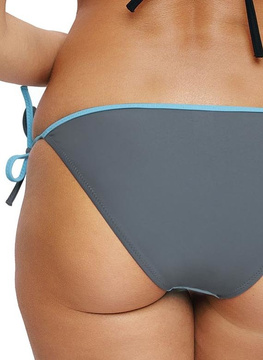 Gładkie miseczki z kontrastową, czarną lamówką są usztywniane, bez push-up-a, dobrze zbierają i usztywniają piersi jednocześnie przybliżając je ku sobie. Dekolt dopełniają dwa, ozdobne paski wykończone maleńką biżuterią. Kuszące figi, typu niskie biodrówki to bardzo kobieca propozycja na plażę. Włoska tkanina. Skład: 80% poliamid, 20% elastan.