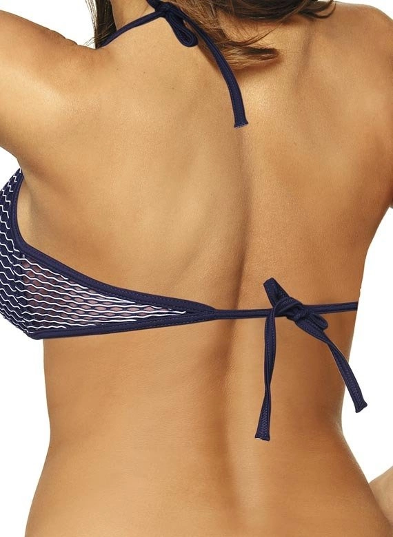 Dwuczęściowe cacuszko, z biustonoszem w formie modnego topu. Góra pokryta ażurową siateczką, skrywa trójkątne miseczki oparte na kroju seksownego bikini. Są usztywniane, posiadają boczne fiszbiny i wypełnienie push up, umieszczone w nich na stałe. Dzięki temu piersi wyglądają zjawiskowo pięknie - są uniesione, kształtnie przybliżone do dekoltu i do tego optycznie powiększone. Zarówno ramiączka, jak i obwód biustonosza są wygodnie wiązane. Świetnie sprawdzi się on również jako element plażowej garderoby - z szortami wygląda po prostu obłędnie.