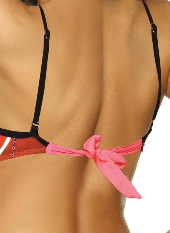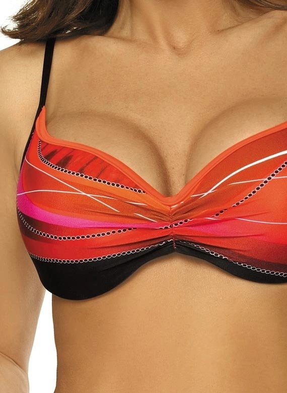 Seksowna nowość z kolekcji Lato 2018 - kostium Naomi M-474. Miseczki wzorzyste, z efektem fal i kaskadowym kolorem, w którym barwy pięknie przechodzą jedna w drugą. Konstrukcja usztywniana, z dolnymi fiszbinami i push up-em, umieszczonym na stałe w biustonoszu. Idealna na małe i średnie biusty, bowiem dla nich pracuje najlepiej - unosi je, modeluje i optycznie powiększa, obdarzając wyjątkowo kobiecym, zmysłowym dekoltem. Ramiączka o regulowanej długości, obwód wiązany na plecach. Wiązania w kolorach dopasowanych do biustonosza.