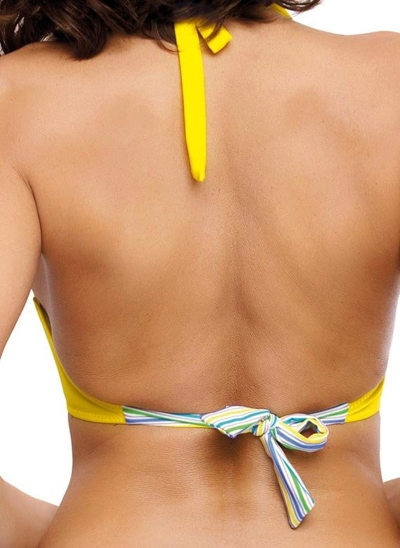 Biustonosz z trójkątnymi miseczkami usztywnianymi specjalną pianką, wzbogacony push-up-em - dzięki niemu piersi uniosą się i optycznie powiększą, tworząc zmysłowy, głęboki dekolt. Push-up umieszczony jest w kostiumie na stałe i nie jest wyjmowany z modelu, występuje w każdym rozmiarze kostiumu. Biustonosz zwraca także uwagę modnym dodatkiem w postaci "pasków-gumek" umieszczonych przy dekolcie. Ładne ramiączka wiązane na szyi, zdobione delikatną, biżuteryjną ozdobą (można ją zdjąć), będą atrakcyjnie prezentować się w promieniach słońca. Majteczki o doskonałym kroju "midi" - o wyśrodkowanej wysokości. Są wzorzyste i ozdobnie wiązane na boku (klasyczny, wkładany krój). Skład: 80% poliamid, 20% elastan.