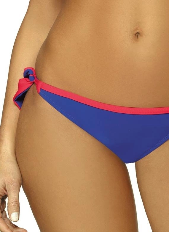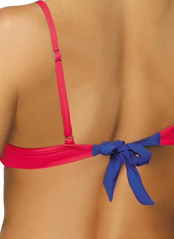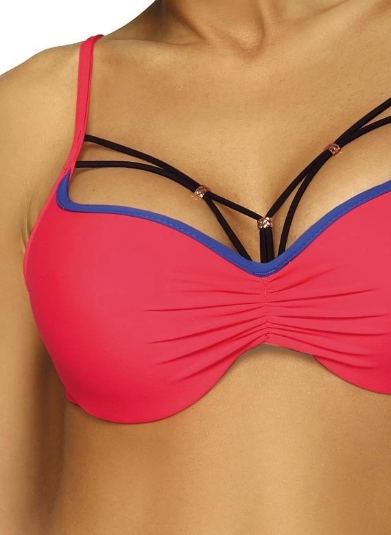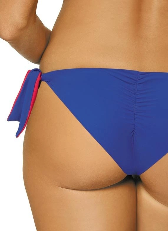 Biustonosz o usztywnianych miseczkach, z fiszbinami i wypełnieniem push up, wbudowanym na stałe do modelu. Świetnie unosi piersi, modeluje je i kusząco powiększa, co zresztą widać na zdjęciu. Strapsy (paski-gumki) są elastyczne, z biżuterią w złotym kolorze i mega modne. Dodają prawdziwego seksapealu, na który śmiało można sobie pozwolić na plaży. Ramiączka o regulowanej długości, nieodpinane. Obwód elastyczny, wiązany na plecach. Figi typu brazylijskiego, wysoko wycięte na pośladkach - seksowne i idealne do opalania. Aby uzyskać pełen, brazylijski efekt figi należy znacząco pociągnąć ku górze bioder. Po bokach wygodne wiązania. Ps. Figi z tyłu mają dodatkowe marszczenie na tkaninie, które optycznie zmysłowo zaokrągla pupę.