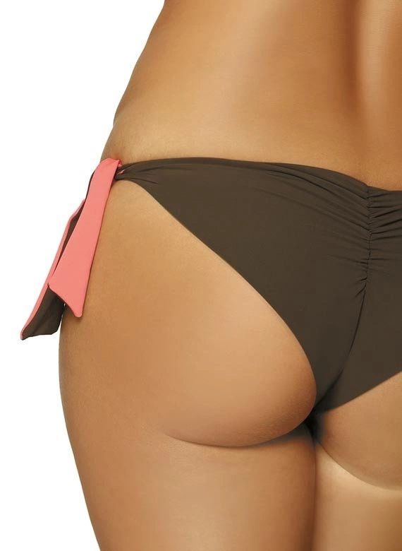 Biustonosz o usztywnianych miseczkach, z fiszbinami i wypełnieniem push up, wbudowanym na stałe do modelu. Świetnie unosi piersi, modeluje je i kusząco powiększa, co zresztą widać na zdjęciu. Strapsy (paski-gumki) są elastyczne, z biżuterią w złotym kolorze i mega modne. Dodają prawdziwego seksapealu, na który śmiało można sobie pozwolić na plaży. Ramiączka o regulowanej długości, nieodpinane. Obwód elastyczny, wiązany na plecach. Figi typu brazylijskiego, wysoko wycięte na pośladkach - seksowne i idealne do opalania. Aby uzyskać pełen, brazylijski efekt figi należy znacząco pociągnąć ku górze bioder. Po bokach wygodne wiązania. Ps. Figi z tyłu mają dodatkowe marszczenie na tkaninie, które optycznie zmysłowo zaokrągla pupę.