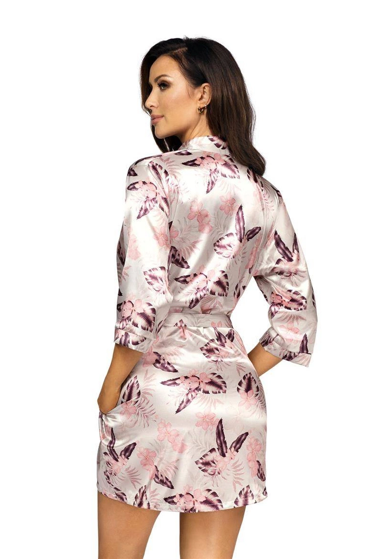 Satynowy szlafrok damski w kolorze pięknej perły, pokryty nadrukiem tropikalnych liści palm i egzotycznych kwiatów... Najmodniejsza obecnie stylistyka, która już zwiastuje lato i wakacje. Tonacja różu, beżu i fioletu na perłowym tle wygląda intrygująco. Szlafrok ma kobiecy, zgrabny fason, jest wiązany w talii za pomocą dołączonego do zestawu paska, a na biodrach wygodne kieszonki. Skład: 98% poliester, 2% elastan.