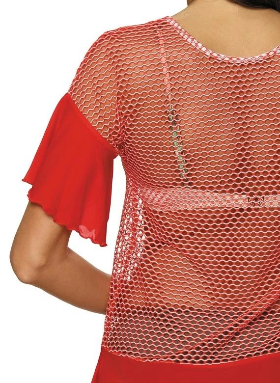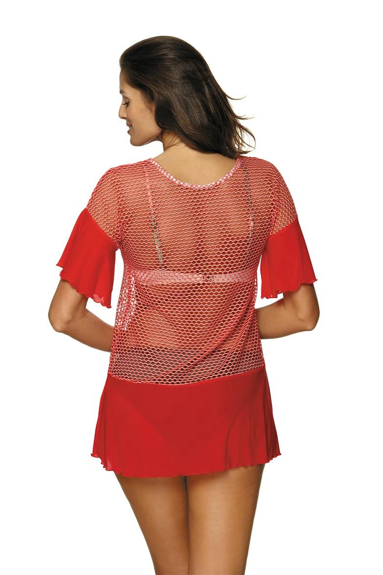 Intrygująca, bardzo modna tunika uszyta z siateczkowej tkaniny. Elastyczna, ciekawa, z seksownym efektem prześwitu. Bardzo ładny dekolt ozdobiony stylowym wiązaniem. Rękawy i okolice ud wykończone falbaną, w modnym, plażowym, kubańskim stylu. Tkanina miękka, świetnie się układa. Prawdziwe cacuszko na plażę.